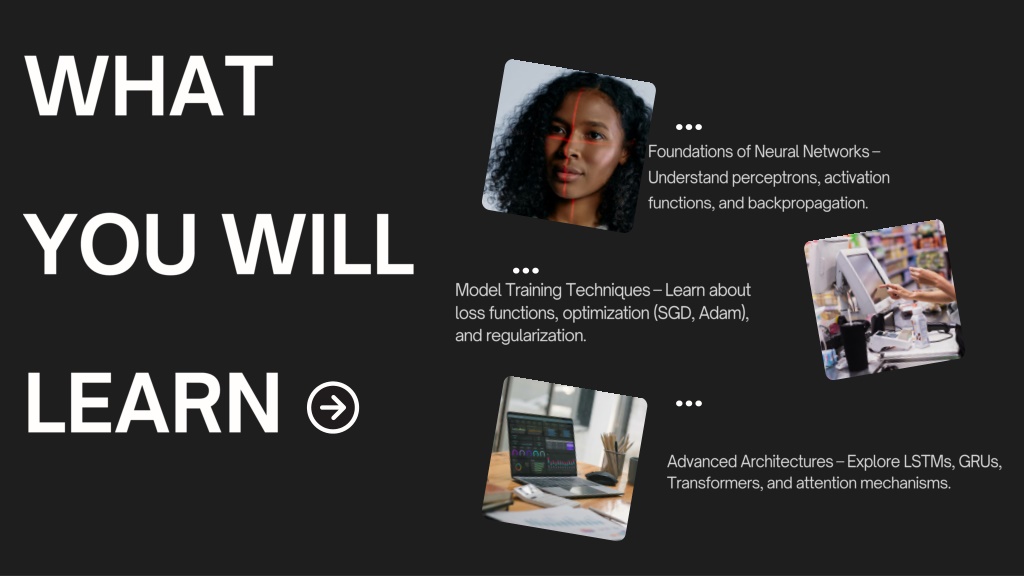 WHAT YOU WILL LEARN Foundations of Neural Networks – Understand perceptrons, activation functions, and backpropagation. Model Training Techniques – Learn about loss functions, optimization (SGD, Adam), and regularization. Advanced Architectures – Explore LSTMs, GRUs, Transformers, and attention mechanisms.
