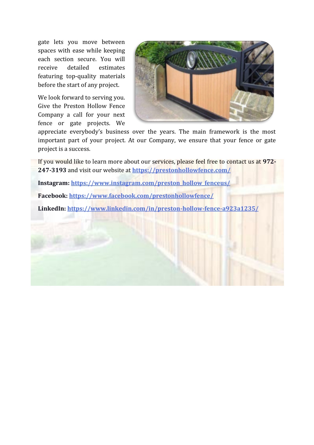 gate lets you move between spaces with ease while keeping each section secure. You will receive detailed featuring top-quality materials before the start of any project. estimates We look forward to serving you. Give the Preston Hollow Fence Company a call for your next fence or gate projects. We appreciate everybody’s business over the years. The main framework is the most important part of your project. At our Company, we ensure that your fence or gate project is a success. If you would like to learn more about our services, please feel free to contact us at 972- 247-3193 and visit our website at https://prestonhollowfence.com/ Instagram: https://www.instagram.com/preston_hollow_fenceus/ Facebook: https://www.facebook.com/prestonhollowfence/ LinkedIn: https://www.linkedin.com/in/preston-hollow-fence-a923a1235/