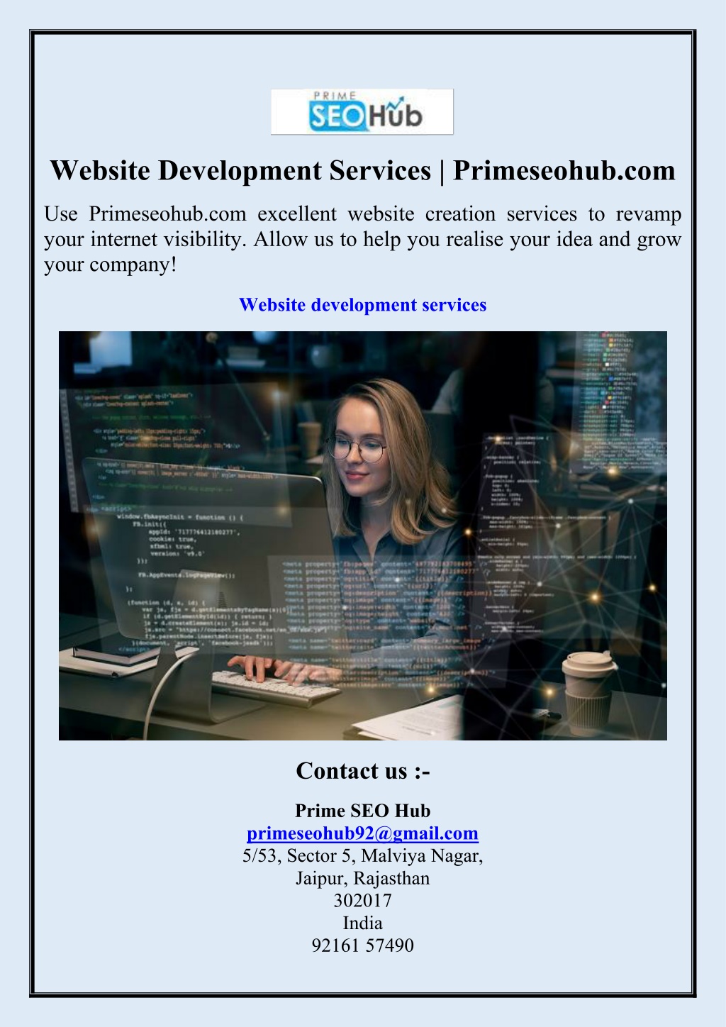 Website Development Services | Primeseohub.com Use Primeseohub.com excellent website creation services to revamp your internet visibility. Allow us to help you realise your idea and grow your company! Website development services Contact us :- Prime SEO Hub primeseohub92@gmail.com 5/53, Sector 5, Malviya Nagar, Jaipur, Rajasthan 302017 India 92161 57490