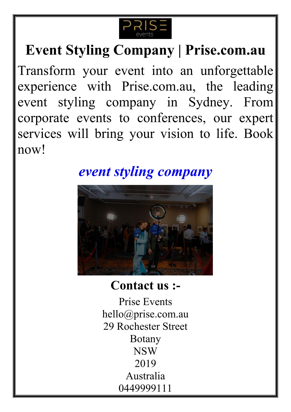 1. Event Styling Company | Prise.com.au Transform your event into an unforgettable experience with Prise.com.au, the leading event styling company in Sydney. From corporate events to conferences, our expert services will bring your vision to life. Book now! event styling company Contact us :- Prise Events hello@prise.com.au 29 Rochester Street Botany NSW 2019 Australia 0449999111