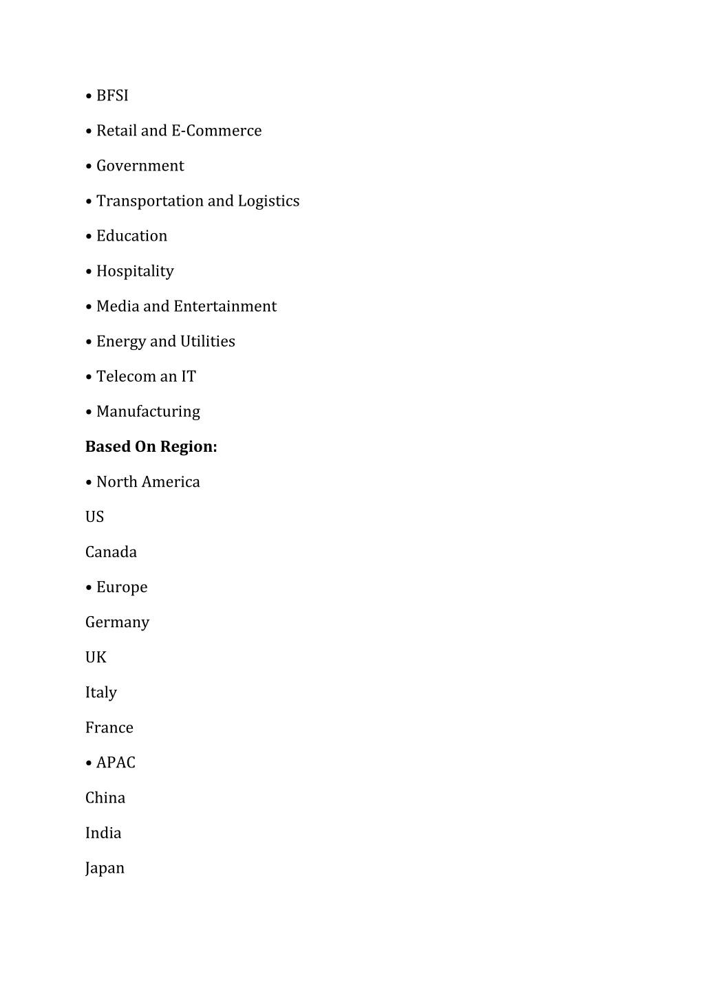 • BFSI • Retail and E-Commerce • Government • Transportation and Logistics • Education • Hospitality • Media and Entertainment • Energy and Utilities • Telecom an IT • Manufacturing Based On Region: • North America US Canada • Europe Germany UK Italy France • APAC China India Japan