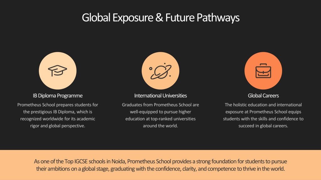 Global Exposure & Future Pathways IB Diploma Programme International Universities Global Careers As one of the Top IGCSE schools in Noida, Prometheus School provides a strong foundation for students to pursue their ambitions on a global stage, graduating with the confidence, clarity, and competence to thrive in the world.