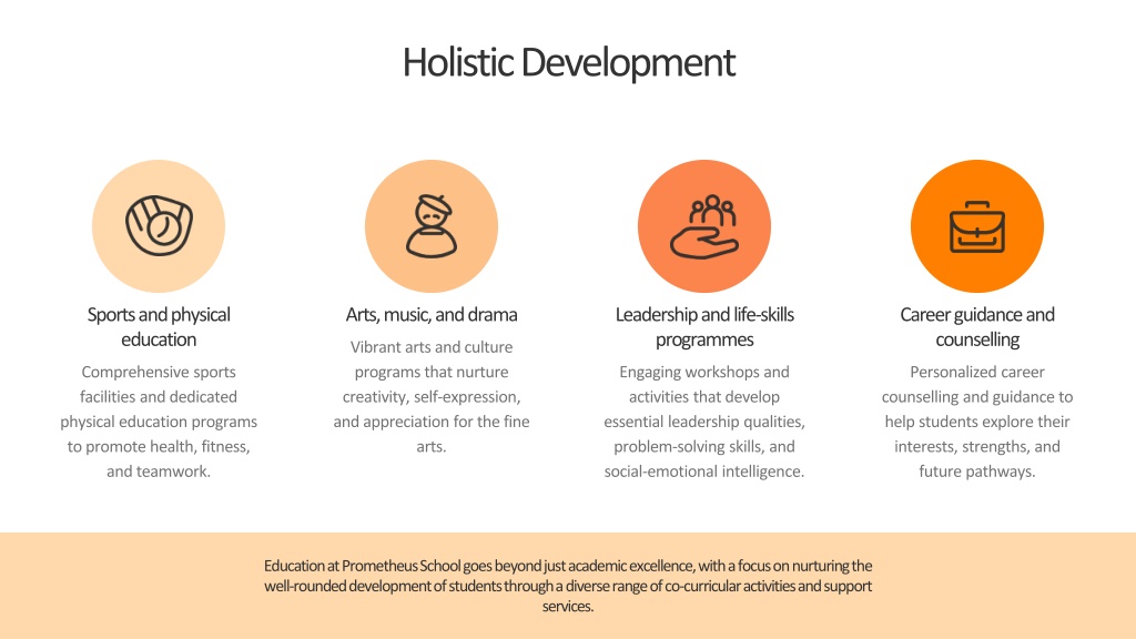 Holistic Development Sports and physical education Arts, music, and drama Leadership and life-skills programmes Career guidance and counselling Education at Prometheus School goes beyond just academic excellence, with a focus on nurturing the well-rounded development of students through a diverse range of co-curricular activities and support services.