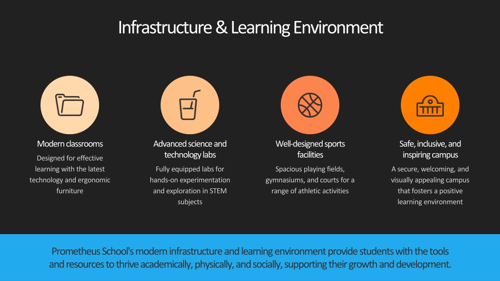 Infrastructure & Learning Environment Modern classrooms Advanced science and technology labs Well-designed sports facilities Safe, inclusive, and inspiring campus Prometheus School's modern infrastructure and learning environment provide students with the tools and resources to thrive academically, physically, and socially, supporting their growth and development.