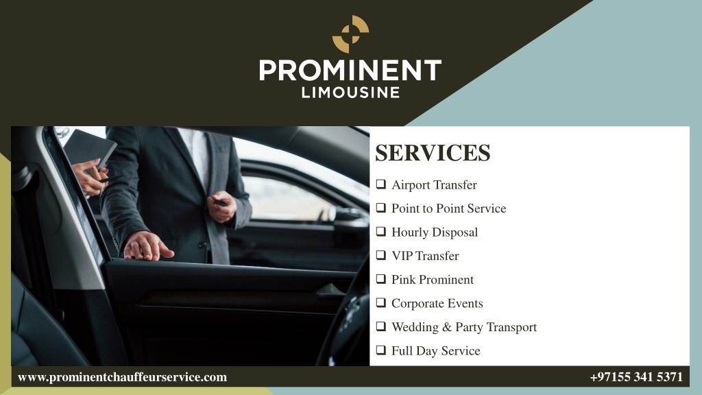 2. ABOUT US Since 2018, Prominent Limousine has been elevating luxury transportation standards across the UAE with a focus on comfort, safety, and professionalism. Serving corporate leaders, tourists, event organizers, and government officials, we ensure every journey is seamless, dependable, and stress-free. Our contemporary fleet is carefully maintained and fitted with modern amenities, while our professional chauffeurs provide punctual, discreet, and tailored service. Driven by a commitment to excellence, Prominent Limousine blends elegance with convenience to deliver refined travel experiences. With a forward-looking vision, we continue to innovate and expand, setting new benchmarks in luxury mobility. www.prominentchauffeurservice.com +97155 341 5371