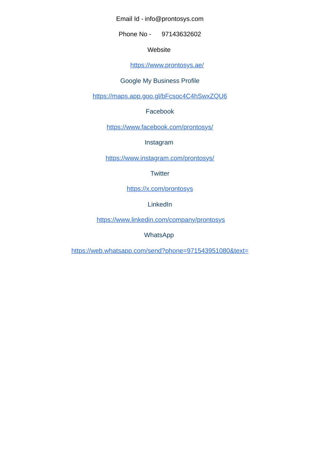 Email Id - info@prontosys.com Phone No - 97143632602 Website https://www.prontosys.ae/ Google My Business Profile https://maps.app.goo.gl/bFcsoc4C4hSwxZQU6 Facebook https://www.facebook.com/prontosys/ Instagram https://www.instagram.com/prontosys/ Twitter https://x.com/prontosys LinkedIn https://www.linkedin.com/company/prontosys WhatsApp https://web.whatsapp.com/send?phone=971543951080&text=
