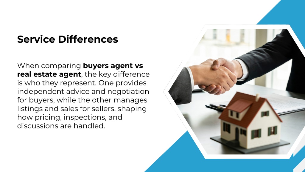 Service Differences When comparing buyers agent vs real estate agent, the key difference is who they represent. One provides independent advice and negotiation for buyers, while the other manages listings and sales for sellers, shaping how pricing, inspections, and discussions are handled.