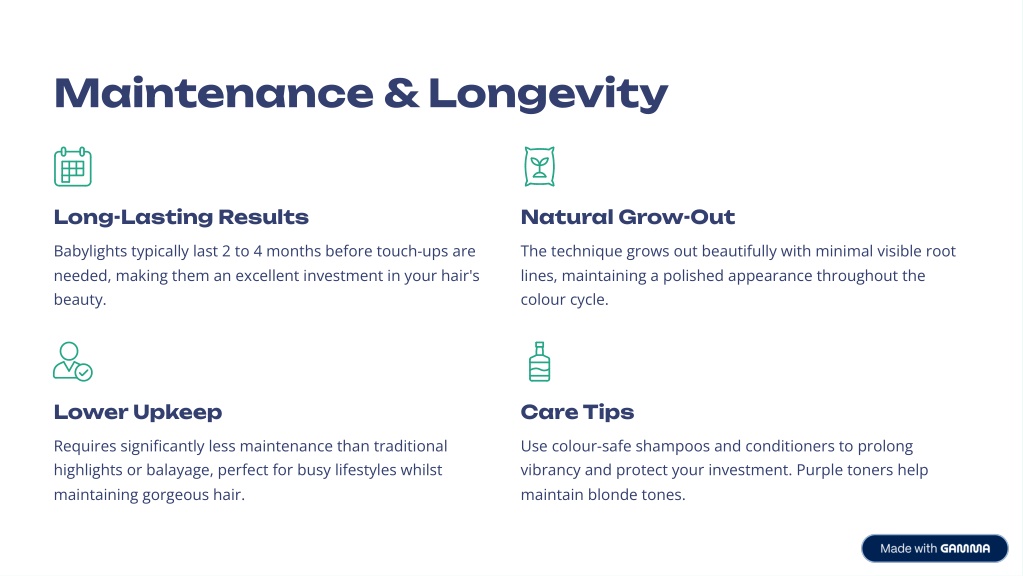 Maintenance & Longevity Long-Lasting Results Natural Grow-Out Babylights typically last 2 to 4 months before touch-ups are needed, making them an excellent investment in your hair's beauty. The technique grows out beautifully with minimal visible root lines, maintaining a polished appearance throughout the colour cycle. Lower Upkeep Care Tips Requires significantly less maintenance than traditional highlights or balayage, perfect for busy lifestyles whilst maintaining gorgeous hair. Use colour-safe shampoos and conditioners to prolong vibrancy and protect your investment. Purple toners help maintain blonde tones.
