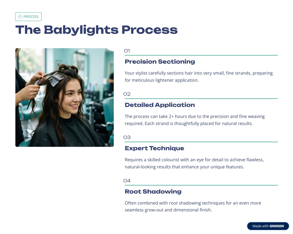 PROCESS The Babylights Process 01 Precision Sectioning Your stylist carefully sections hair into very small, fine strands, preparing for meticulous lightener application. 02 Detailed Application The process can take 2+ hours due to the precision and fine weaving required. Each strand is thoughtfully placed for natural results. 03 Expert Technique Requires a skilled colourist with an eye for detail to achieve flawless, natural-looking results that enhance your unique features. 04 Root Shadowing Often combined with root shadowing techniques for an even more seamless grow-out and dimensional finish.