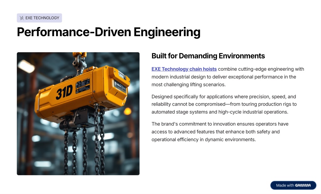 EXE TECHNOLOGY Performance-Driven Engineering Built for Demanding Environments EXE Technology chain hoists combine cutting-edge engineering with modern industrial design to deliver exceptional performance in the most challenging lifting scenarios. Designed specifically for applications where precision, speed, and reliability cannot be compromised—from touring production rigs to automated stage systems and high-cycle industrial operations. The brand's commitment to innovation ensures operators have access to advanced features that enhance both safety and operational efficiency in dynamic environments.