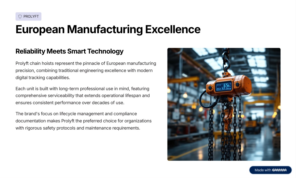 PROLYFT European Manufacturing Excellence Reliability Meets Smart Technology Prolyft chain hoists represent the pinnacle of European manufacturing precision, combining traditional engineering excellence with modern digital tracking capabilities. Each unit is built with long-term professional use in mind, featuring comprehensive serviceability that extends operational lifespan and ensures consistent performance over decades of use. The brand's focus on lifecycle management and compliance documentation makes Prolyft the preferred choice for organizations with rigorous safety protocols and maintenance requirements.