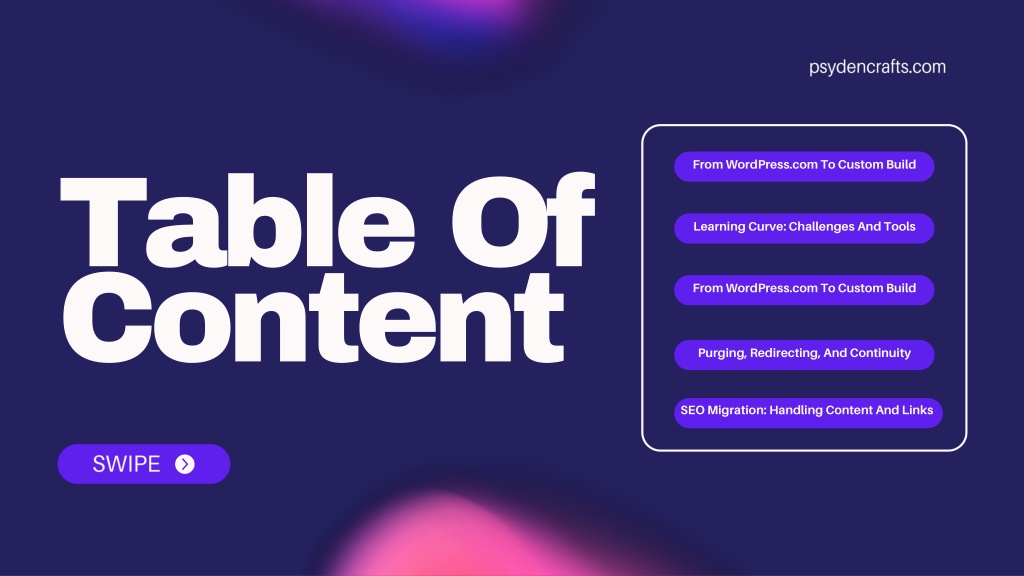 psydencrafts.com From WordPress.com To Custom Build Table Of Learning Curve: Challenges And Tools Content From WordPress.com To Custom Build Purging, Redirecting, And Continuity SEO Migration: Handling Content And Links SWIPE