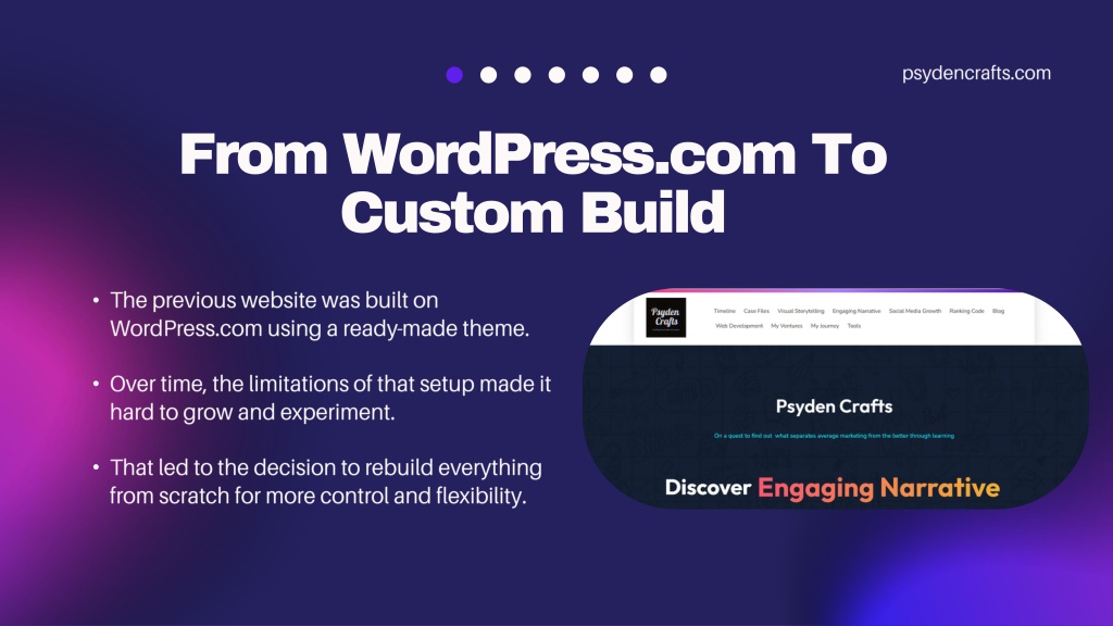 psydencrafts.com From WordPress.com To Custom Build • The previous website was built on WordPress.com using a ready-made theme. • Over time, the limitations of that setup made it hard to grow and experiment. • That led to the decision to rebuild everything from scratch for more control and flexibility.