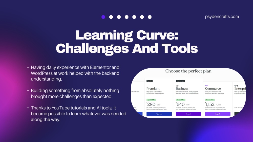 psydencrafts.com Learning Curve: Challenges And Tools • Having daily experience with Elementor and WordPress at work helped with the backend understanding. • Building something from absolutely nothing brought more challenges than expected. • Thanks to YouTube tutorials and AI tools, it became possible to learn whatever was needed along the way.