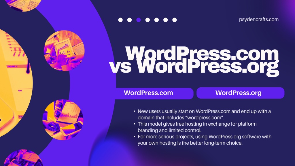 psydencrafts.com WordPress.com vs WordPress.org WordPress.com WordPress.org • New users usually start on WordPress.com and end up with a domain that includes “wordpress.com”. • This model gives free hosting in exchange for platform branding and limited control. • For more serious projects, using WordPress.org software with your own hosting is the better long-term choice.