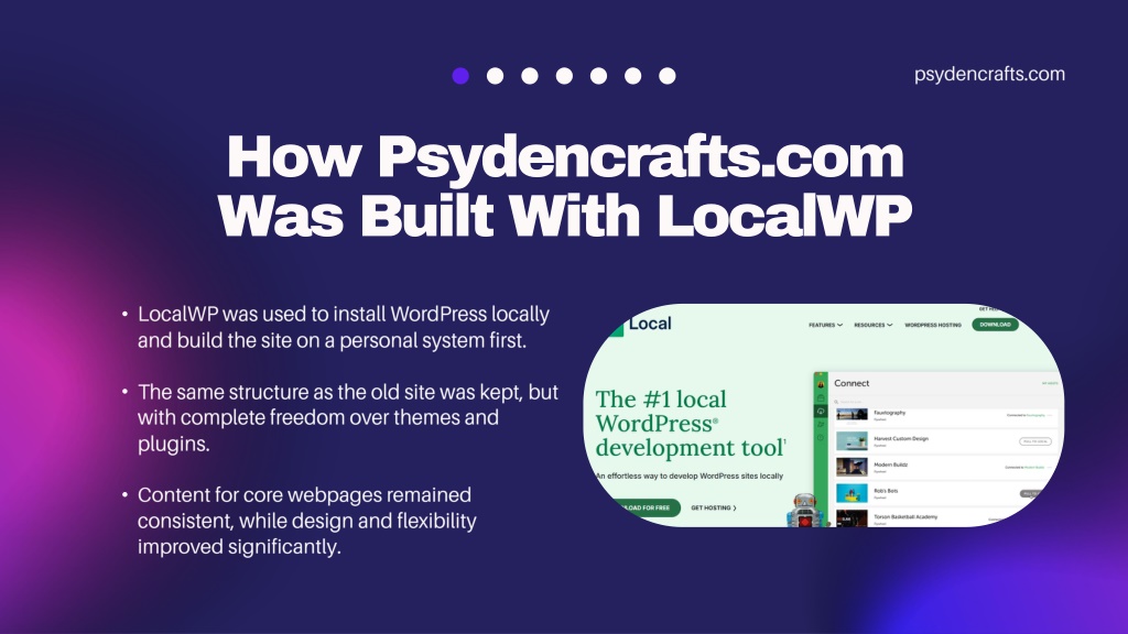 psydencrafts.com How Psydencrafts.com Was Built With LocalWP • LocalWP was used to install WordPress locally and build the site on a personal system first. • The same structure as the old site was kept, but with complete freedom over themes and plugins. • Content for core webpages remained consistent, while design and flexibility improved significantly.