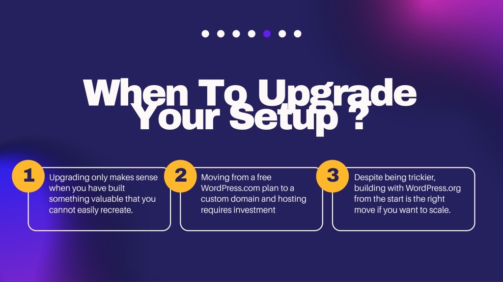 When To Upgrade Your Setup ? Upgrading only makes sense when you have built something valuable that you cannot easily recreate. Moving from a free WordPress.com plan to a custom domain and hosting requires investment Despite being trickier, building with WordPress.org from the start is the right move if you want to scale. 1 2 3