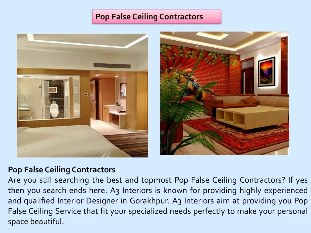 Pop False Ceiling Contractors Pop FalseCeilingContractors Are you still searching the best and topmost Pop False Ceiling Contractors? If yes then you search ends here. A3 Interiors is known for providing highly experienced and qualified Interior Designer in Gorakhpur. A3 Interiors aim at providing you Pop False Ceiling Service that fit your specialized needs perfectly to make your personal space beautiful.