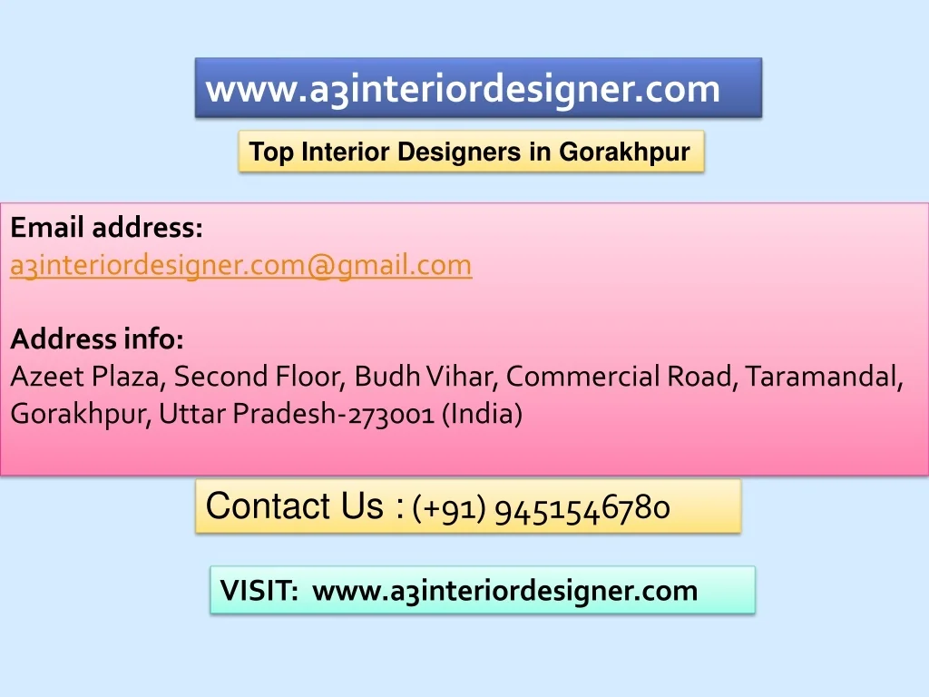 www.a3interiordesigner.com Top Interior Designers in Gorakhpur Email address: a3interiordesigner.com@gmail.com Address info: Azeet Plaza, Second Floor, BudhVihar, Commercial Road, Taramandal, Gorakhpur, Uttar Pradesh-273001 (India) Contact Us :(+91) 9451546780 VISIT: www.a3interiordesigner.com