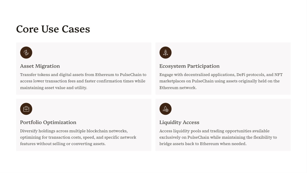 Core Use Cases Asset Migration Ecosystem Participation Transfer tokens and digital assets from Ethereum to PulseChain to access lower transaction fees and faster confirmation times while maintaining asset value and utility. Engage with decentralized applications, DeFi protocols, and NFT marketplaces on PulseChain using assets originally held on the Ethereum network. Portfolio Optimization Liquidity Access Diversify holdings across multiple blockchain networks, optimizing for transaction costs, speed, and specific network features without selling or converting assets. Access liquidity pools and trading opportunities available exclusively on PulseChain while maintaining the flexibility to bridge assets back to Ethereum when needed.