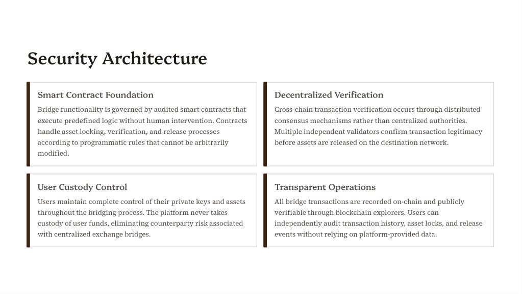 Security Architecture Smart Contract Foundation Decentralized Verification Bridge functionality is governed by audited smart contracts that execute predefined logic without human intervention. Contracts handle asset locking, verification, and release processes according to programmatic rules that cannot be arbitrarily modified. Cross-chain transaction verification occurs through distributed consensus mechanisms rather than centralized authorities. Multiple independent validators confirm transaction legitimacy before assets are released on the destination network. User Custody Control Transparent Operations Users maintain complete control of their private keys and assets throughout the bridging process. The platform never takes custody of user funds, eliminating counterparty risk associated with centralized exchange bridges. All bridge transactions are recorded on-chain and publicly verifiable through blockchain explorers. Users can independently audit transaction history, asset locks, and release events without relying on platform-provided data.