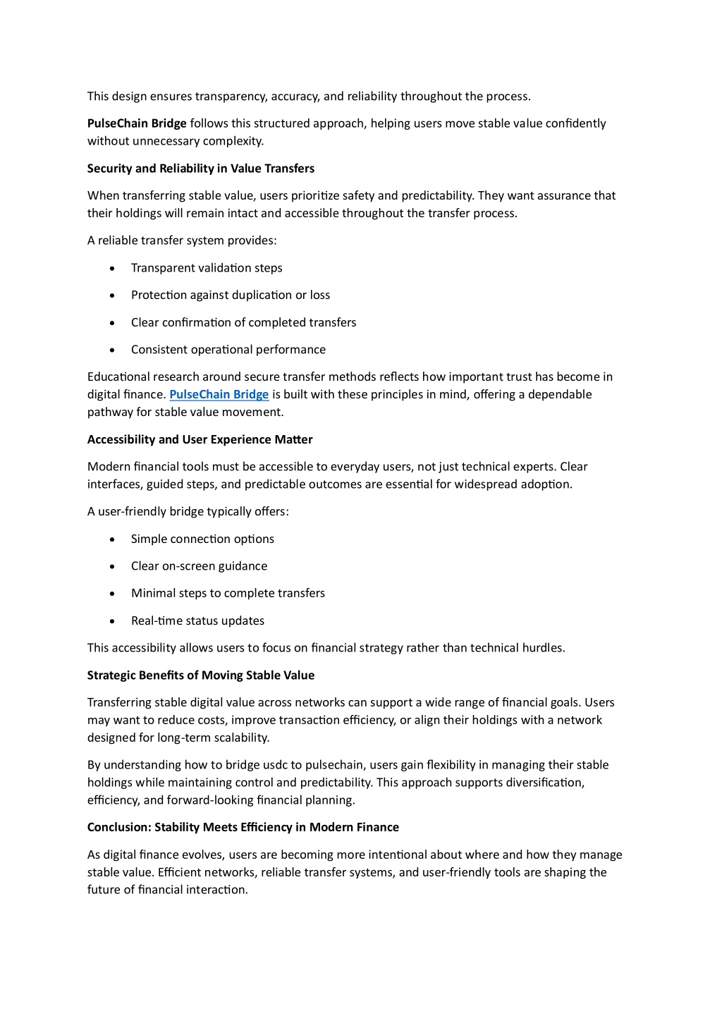 2. This design ensures transparency, accuracy, and reliability throughout the process. PulseChain Bridge follows this structured approach, helping users move stable value confidently without unnecessary complexity. Security and Reliability in Value Transfers When transferring stable value, users prioritize safety and predictability. They want assurance that their holdings will remain intact and accessible throughout the transfer process. A reliable transfer system provides: • Transparent validation steps • Protection against duplication or loss • Clear confirmation of completed transfers • Consistent operational performance Educational research around secure transfer methods reflects how important trust has become in digital finance. PulseChain Bridge is built with these principles in mind, offering a dependable pathway for stable value movement. Accessibility and User Experience Matter Modern financial tools must be accessible to everyday users, not just technical experts. Clear interfaces, guided steps, and predictable outcomes are essential for widespread adoption. A user-friendly bridge typically offers: • Simple connection options • Clear on-screen guidance • Minimal steps to complete transfers • Real-time status updates This accessibility allows users to focus on financial strategy rather than technical hurdles. Strategic Benefits of Moving Stable Value Transferring stable digital value across networks can support a wide range of financial goals. Users may want to reduce costs, improve transaction efficiency, or align their holdings with a network designed for long-term scalability. By understanding how to bridge usdc to pulsechain, users gain flexibility in managing their stable holdings while maintaining control and predictability. This approach supports diversification, efficiency, and forward-looking financial planning. Conclusion: Stability Meets Efficiency in Modern Finance As digital finance evolves, users are becoming more intentional about where and how they manage stable value. Efficient networks, reliable transfer systems, and user-friendly tools are shaping the future of financial interaction.