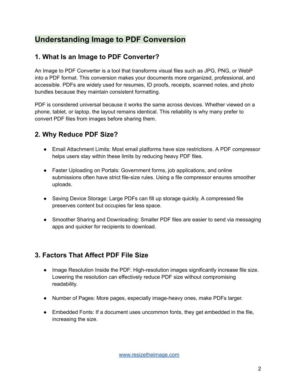 2. Understanding Image to PDF Conversion 1. What Is an Image to PDF Converter? An Image to PDF Converter is a tool that transforms visual files such as JPG, PNG, or WebP into a PDF format. This conversion makes your documents more organized, professional, and accessible. PDFs are widely used for resumes, ID proofs, receipts, scanned notes, and photo bundles because they maintain consistent formatting. PDF is considered universal because it works the same across devices. Whether viewed on a phone, tablet, or laptop, the layout remains identical. This reliability is why many prefer to convert PDF files from images before sharing them. 2. Why Reduce PDF Size? ● Email Attachment Limits: Most email platforms have size restrictions. A PDF compressor helps users stay within these limits by reducing heavy PDF files. ● Faster Uploading on Portals: Government forms, job applications, and online submissions often have strict file-size rules. Using a file compressor ensures smoother uploads. ● Saving Device Storage: Large PDFs can fill up storage quickly. A compressed file preserves content but occupies far less space. ● Smoother Sharing and Downloading: Smaller PDF files are easier to send via messaging apps and quicker for recipients to download. 3. Factors That Affect PDF File Size ● Image Resolution Inside the PDF: High-resolution images significantly increase file size. Lowering the resolution can effectively reduce PDF size without compromising readability. ● Number of Pages: More pages, especially image-heavy ones, make PDFs larger. ● Embedded Fonts: If a document uses uncommon fonts, they get embedded in the file, increasing the size. www.resizetheimage.com 2