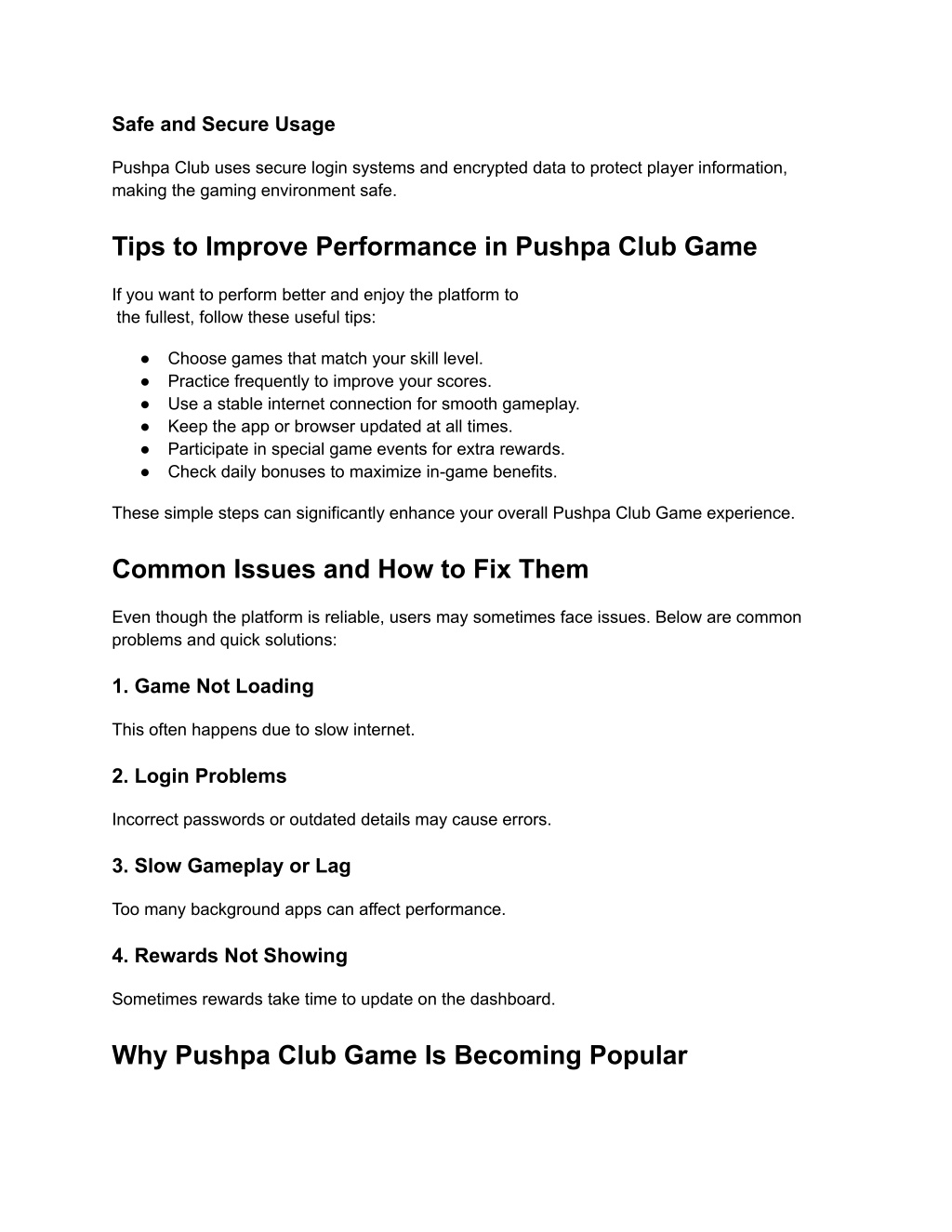 Safe and Secure Usage Pushpa Club uses secure login systems and encrypted data to protect player information, making the gaming environment safe. Tips to Improve Performance in Pushpa Club Game If you want to perform better and enjoy the platform to the fullest, follow these useful tips: ● Choose games that match your skill level. ● Practice frequently to improve your scores. ● Use a stable internet connection for smooth gameplay. ● Keep the app or browser updated at all times. ● Participate in special game events for extra rewards. ● Check daily bonuses to maximize in-game benefits. These simple steps can significantly enhance your overall Pushpa Club Game experience. Common Issues and How to Fix Them Even though the platform is reliable, users may sometimes face issues. Below are common problems and quick solutions: 1. Game Not Loading This often happens due to slow internet. 2. Login Problems Incorrect passwords or outdated details may cause errors. 3. Slow Gameplay or Lag Too many background apps can affect performance. 4. Rewards Not Showing Sometimes rewards take time to update on the dashboard. Why Pushpa Club Game Is Becoming Popular