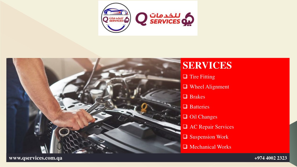 3. SERVICES ❑ Tire Fitting ❑ Wheel Alignment ❑ Brakes ❑ Batteries ❑ Oil Changes ❑ AC Repair Services ❑ Suspension Work ❑ Mechanical Works www.qservices.com.qa +974 4002 2323