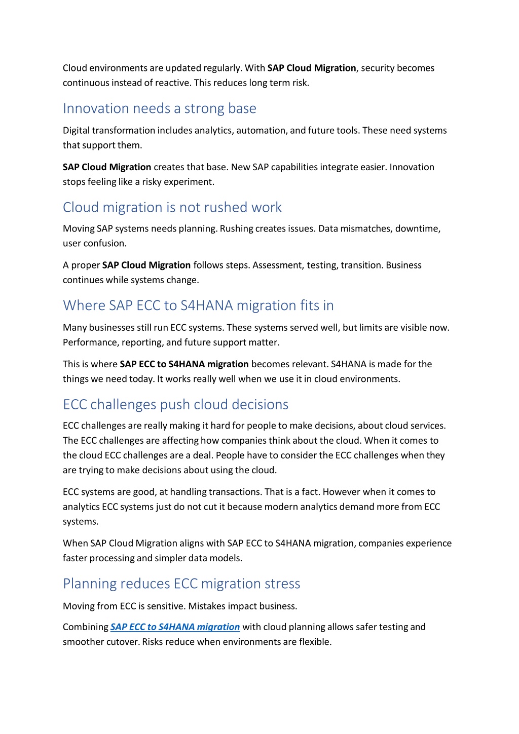Cloudenvironmentsareupdatedregularly.WithSAPCloudMigration,securitybecomes continuousinsteadofreactive.Thisreduceslongtermrisk. Innovationneedsastrongbase Digitaltransformationincludesanalytics,automation,andfuturetools.Theseneedsystems thatsupportthem. SAPCloudMigration createsthatbase.NewSAPcapabilitiesintegrateeasier.Innovation stopsfeelinglikeariskyexperiment. Cloudmigrationisnotrushedwork MovingSAPsystemsneedsplanning.Rushingcreatesissues.Datamismatches,downtime, user confusion. AproperSAPCloudMigrationfollowssteps.Assessment,testing,transition.Business continueswhilesystemschange. WhereSAPECCtoS4HANAmigrationfitsin ManybusinessesstillrunECCsystems.Thesesystemsservedwell,butlimitsarevisiblenow. Performance,reporting,andfuturesupportmatter. ThisiswhereSAPECCtoS4HANAmigrationbecomesrelevant.S4HANAismadeforthe thingsweneedtoday.Itworksreallywellwhenweuseitincloudenvironments. ECCchallengespushclouddecisions ECCchallengesarereallymakingithardforpeopletomakedecisions,aboutcloudservices. TheECCchallengesareaffectinghowcompaniesthinkaboutthecloud.Whenitcomesto thecloudECCchallengesareadeal.PeoplehavetoconsidertheECCchallengeswhenthey aretryingtomakedecisionsaboutusingthecloud. ECCsystemsaregood,athandlingtransactions.Thatisafact.Howeverwhenitcomesto analyticsECCsystemsjustdonotcutitbecausemodernanalyticsdemandmorefromECC systems. WhenSAPCloudMigrationalignswithSAPECCtoS4HANAmigration,companiesexperience fasterprocessingandsimplerdatamodels. PlanningreducesECCmigrationstress MovingfromECCissensitive.Mistakesimpactbusiness. CombiningSAPECCtoS4HANAmigrationwithcloudplanningallowssafertestingand smoothercutover. Risksreducewhenenvironmentsareflexible.