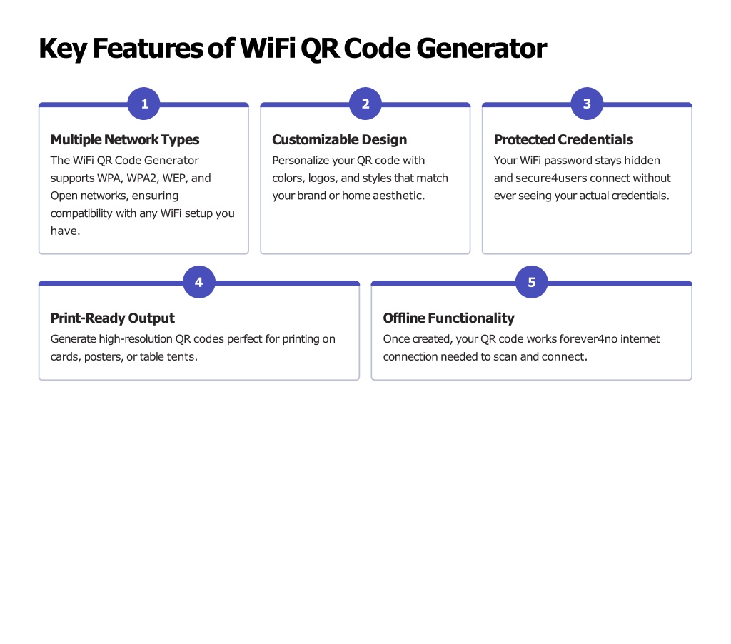 KeyFeaturesofWiFiQRCodeGenerator 1 2 3 MultipleNetworkTypes TheWiFiQRCodeGenerator supportsWPA,WPA2,WEP,and Opennetworks,ensuring compatibilitywithanyWiFisetupyou have. CustomizableDesign PersonalizeyourQRcodewith colors,logos,andstylesthatmatch yourbrandorhomeaesthetic. ProtectedCredentials YourWiFipasswordstayshidden andsecure4usersconnectwithout everseeingyouractualcredentials. 4 5 Print-ReadyOutput Generatehigh-resolutionQRcodesperfectforprintingon cards,posters,ortabletents. OfflineFunctionality Oncecreated,yourQRcodeworksforever4nointernet connectionneededtoscanandconnect.