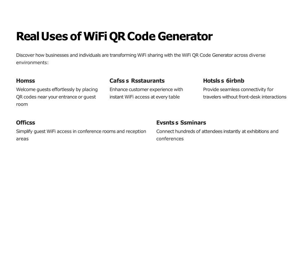 RealUsesofWiFiQRCodeGenerator DiscoverhowbusinessesandindividualsaretransformingWiFisharingwiththeWiFiQRCodeGeneratoracrossdiverse environments: Homss Welcomeguestseffortlesslybyplacing QRcodesnearyourentranceorguest room CafsssRsstaurants Enhancecustomerexperiencewith instantWiFiaccessateverytable Hotslss6irbnb Provideseamlessconnectivityfor travelerswithoutfront-deskinteractions Officss SimplifyguestWiFiaccessinconferenceroomsandreception areas EvsntssSsminars Connecthundredsofattendeesinstantlyatexhibitionsand conferences