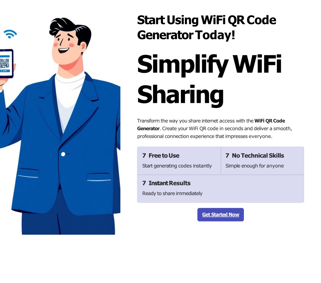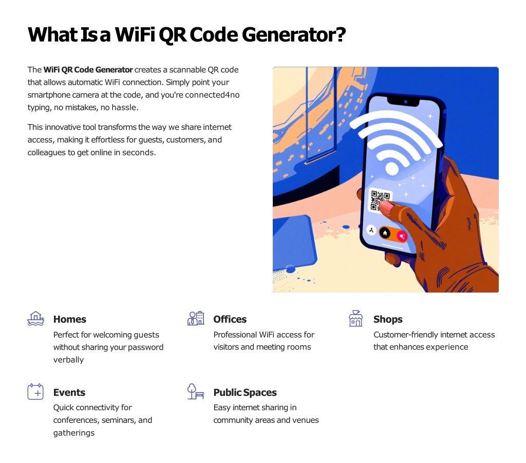 Streamline your WiFi access using the WiFi QR Code Generator, designed for speed, simplicity, and security. Generate QR codes instantly and share your network effortlessly. The WiFi QR Code Generator is perfect for homes, offices, and public spaces. Use the WiFi QR Code Generator now and make WiFi sharing quick, simple, and secure!<br>