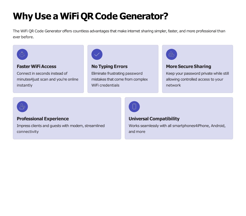 WhyUseaWiFiQRCodeGenerator? TheWiFiQRCodeGeneratorofferscountlessadvantagesthat make internetsharingsimpler,faster,andmoreprofessionalthan everbefore. FasterWiFiAccess Connectinsecondsinsteadof minutes4justscanandyou'reonline instantly NoTypingErrors Eliminatefrustratingpassword mistakesthatcomefromcomplex WiFicredentials MoreSecureSharing Keepyourpasswordprivatewhilestill allowingcontrolledaccesstoyour network ProfessionalExperience Impressclientsandguestswithmodern,streamlined connectivity UniversalCompatibility Worksseamlesslywithallsmartphones4iPhone,Android, andmore