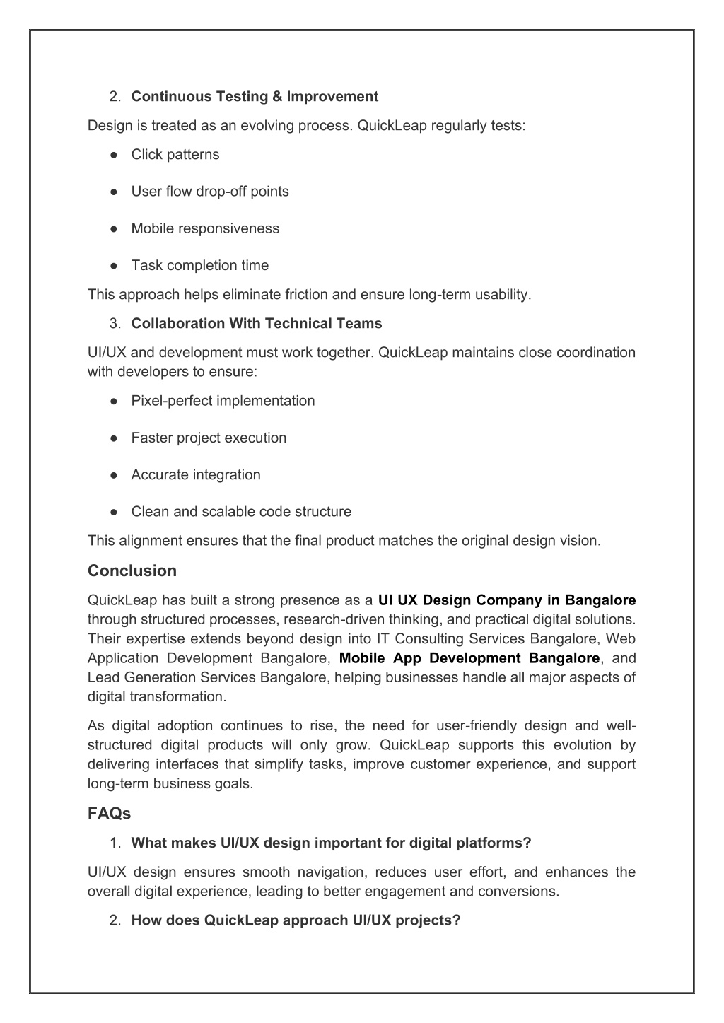 2. Continuous Testing & Improvement Design is treated as an evolving process. QuickLeap regularly tests: ● Click patterns ● User flow drop-off points ● Mobile responsiveness ● Task completion time This approach helps eliminate friction and ensure long-term usability. 3. Collaboration With Technical Teams UI/UX and development must work together. QuickLeap maintains close coordination with developers to ensure: ● Pixel-perfect implementation ● Faster project execution ● Accurate integration ● Clean and scalable code structure This alignment ensures that the final product matches the original design vision. Conclusion QuickLeap has built a strong presence as a UI UX Design Company in Bangalore through structured processes, research-driven thinking, and practical digital solutions. Their expertise extends beyond design into IT Consulting Services Bangalore, Web Application Development Bangalore, Mobile App Development Bangalore, and Lead Generation Services Bangalore, helping businesses handle all major aspects of digital transformation. As digital adoption continues to rise, the need for user-friendly design and well- structured digital products will only grow. QuickLeap supports this evolution by delivering interfaces that simplify tasks, improve customer experience, and support long-term business goals. FAQs 1. What makes UI/UX design important for digital platforms? UI/UX design ensures smooth navigation, reduces user effort, and enhances the overall digital experience, leading to better engagement and conversions. 2. How does QuickLeap approach UI/UX projects?