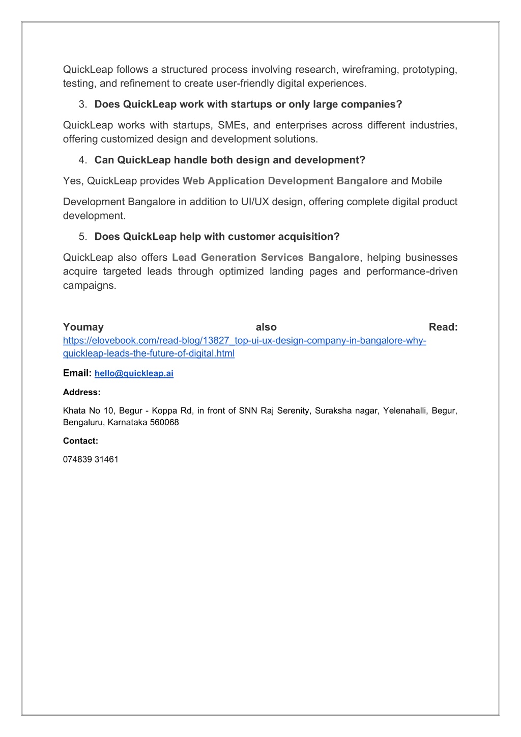 QuickLeap follows a structured process involving research, wireframing, prototyping, testing, and refinement to create user-friendly digital experiences. 3. Does QuickLeap work with startups or only large companies? QuickLeap works with startups, SMEs, and enterprises across different industries, offering customized design and development solutions. 4. Can QuickLeap handle both design and development? Yes, QuickLeap provides Web Application Development Bangalore and Mobile Development Bangalore in addition to UI/UX design, offering complete digital product development. 5. Does QuickLeap help with customer acquisition? QuickLeap also offers Lead Generation Services Bangalore, helping businesses acquire targeted leads through optimized landing pages and performance-driven campaigns. Youmay https://elovebook.com/read-blog/13827_top-ui-ux-design-company-in-bangalore-why- quickleap-leads-the-future-of-digital.html also Read: Email: hello@quickleap.ai Address: Khata No 10, Begur - Koppa Rd, in front of SNN Raj Serenity, Suraksha nagar, Yelenahalli, Begur, Bengaluru, Karnataka 560068 Contact: 074839 31461