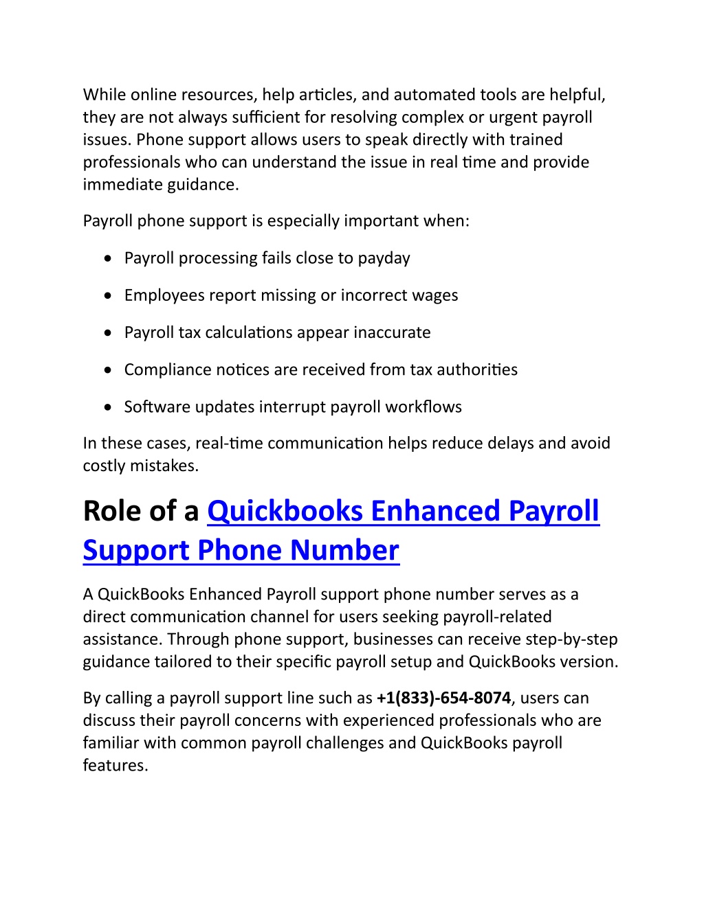 While online resources, help articles, and automated tools are helpful, they are not always sufficient for resolving complex or urgent payroll issues. Phone support allows users to speak directly with trained professionals who can understand the issue in real time and provide immediate guidance. Payroll phone support is especially important when: · Payroll processing fails close to payday · Employees report missing or incorrect wages · Payroll tax calculations appear inaccurate · Compliance notices are received from tax authorities · Software updates interrupt payroll workflows In these cases, real-time communication helps reduce delays and avoid costly mistakes. Role of a Quickbooks Enhanced Payroll Support Phone Number A QuickBooks Enhanced Payroll support phone number serves as a direct communication channel for users seeking payroll-related assistance. Through phone support, businesses can receive step-by-step guidance tailored to their specific payroll setup and QuickBooks version. By calling a payroll support line such as +1(833)-654-8074, users can discuss their payroll concerns with experienced professionals who are familiar with common payroll challenges and QuickBooks payroll features.
