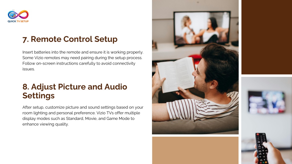 6. 7. Remote Control Setup Insert batteries into the remote and ensure it is working properly. Some Vizio remotes may need pairing during the setup process. Follow on-screen instructions carefully to avoid connectivity issues. 8. Adjust Picture and Audio Settings After setup, customize picture and sound settings based on your room lighting and personal preference. Vizio TVs offer multiple display modes such as Standard, Movie, and Game Mode to enhance viewing quality.