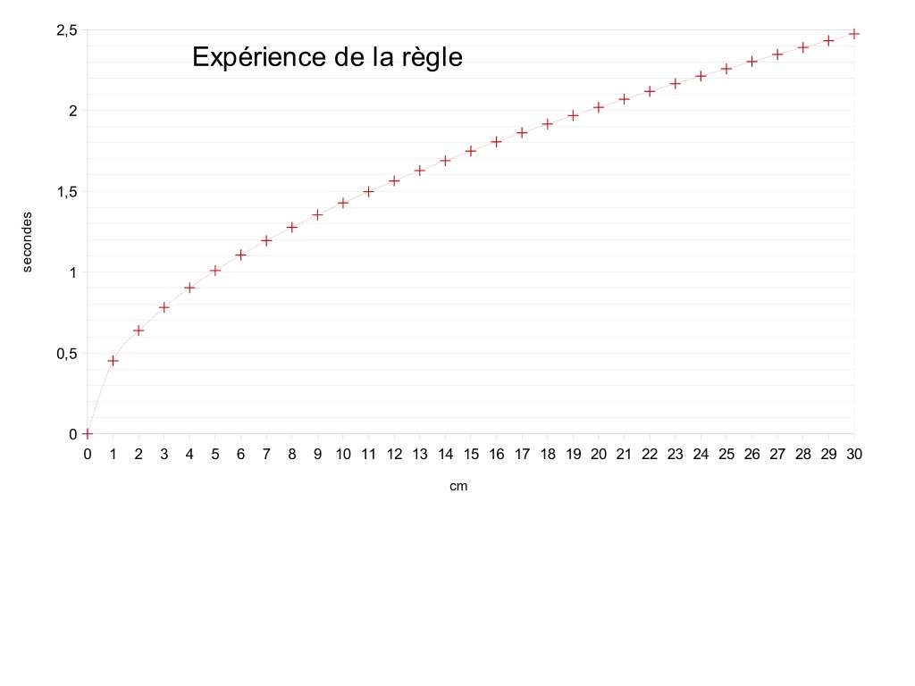 2,5 Expérience de la règle 2 1,5 secondes 1 0,5 0 0 1 2 3 4 5 6 7 8 9 10 11 12 13 14 15 16 17 18 19 20 21 22 23 24 25 26 27 28 29 30 cm