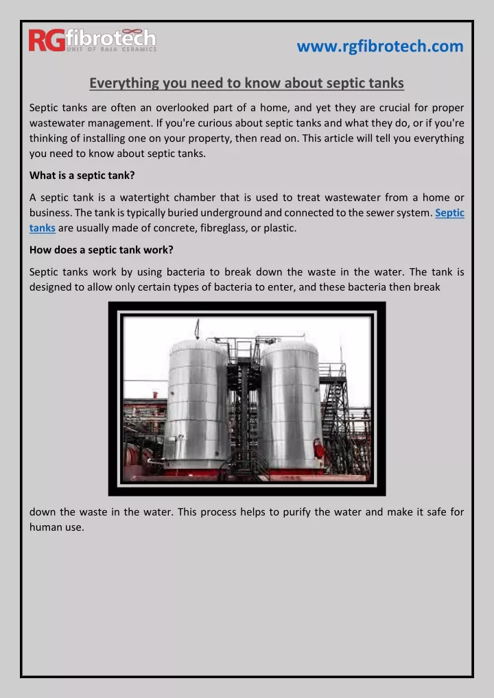 www.rgfibrotech.com Everything you need to know about septic tanks Septic tanks are often an overlooked part of a home, and yet they are crucial for proper wastewater management. If you're curious about septic tanks and what they do, or if you're thinking of installing one on your property, then read on. This article will tell you everything you need to know about septic tanks. What is a septic tank? A septic tank is a watertight chamber that is used to treat wastewater from a home or business. The tank is typically buried underground and connected to the sewer system. Septic tanks are usually made of concrete, fibreglass, or plastic. How does a septic tank work? Septic tanks work by using bacteria to break down the waste in the water. The tank is designed to allow only certain types of bacteria to enter, and these bacteria then break down the waste in the water. This process helps to purify the water and make it safe for human use.