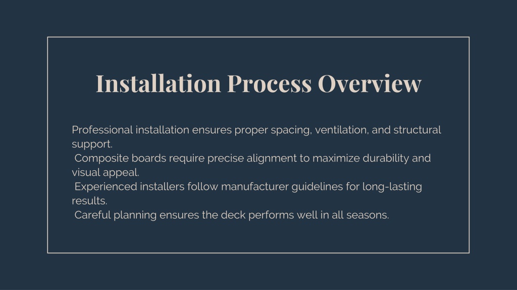 5. Installation Process Overview Professional installation ensures proper spacing, ventilation, and structural support. Composite boards require precise alignment to maximize durability and visual appeal. Experienced installers follow manufacturer guidelines for long-lasting results. Careful planning ensures the deck performs well in all seasons.