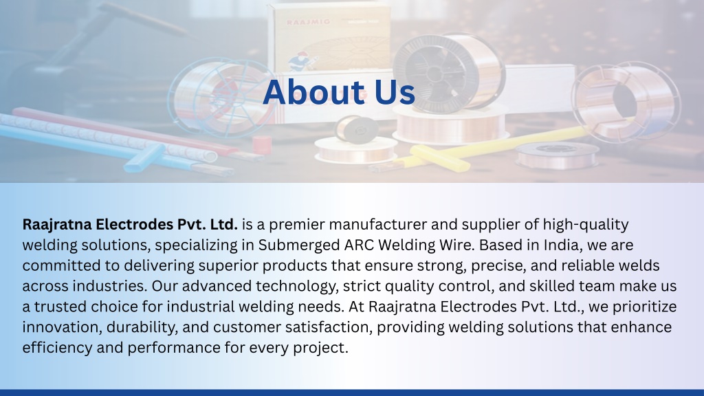 About Us Raajratna Electrodes Pvt. Ltd. is a premier manufacturer and supplier of high-quality welding solutions, specializing in Submerged ARC Welding Wire. Based in India, we are committed to delivering superior products that ensure strong, precise, and reliable welds across industries. Our advanced technology, strict quality control, and skilled team make us a trusted choice for industrial welding needs. At Raajratna Electrodes Pvt. Ltd., we prioritize innovation, durability, and customer satisfaction, providing welding solutions that enhance efficiency and performance for every project.