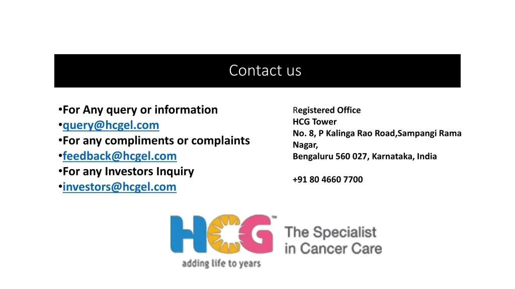 Contact us • For Any query or information • query@hcgel.com • For any compliments or complaints • feedback@hcgel.com • For any Investors Inquiry • investors@hcgel.com Registered Office HCG Tower No. 8, P Kalinga Rao Road,Sampangi Rama Nagar, Bengaluru 560 027, Karnataka, India +91 80 4660 7700