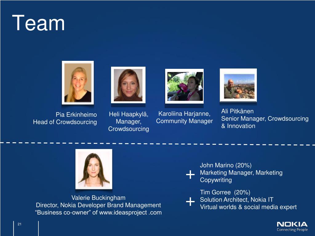 Team Ali Pitkänen Senior Manager, Crowdsourcing & Innovation Karoliina Harjanne, Community Manager Heli Haapkylä, Manager, Crowdsourcing Pia Erkinheimo Head of Crowdsourcing John Marino (20%) Marketing Manager, Marketing Copywriting + Tim Gorree (20%) Solution Architect, Nokia IT Virtual worlds & social media expert + Valerie Buckingham Director, Nokia Developer Brand Management “Business co-owner” of www.ideasproject .com
