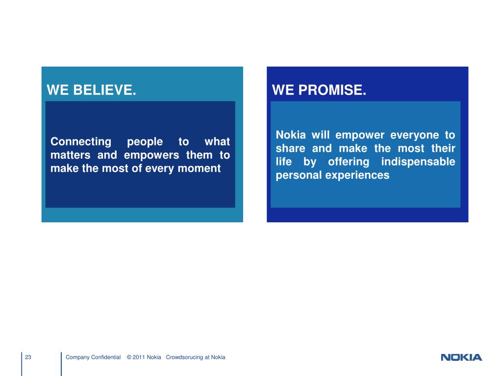 WE BELIEVE. WE PROMISE. Connecting people to whatmatters and empowersthem to make the most of everymoment Nokia willempowereveryone to share and make the mosttheir life byofferingindispensablepersonalexperiences Company Confidential © 2011 Nokia Crowdsorucing at Nokia