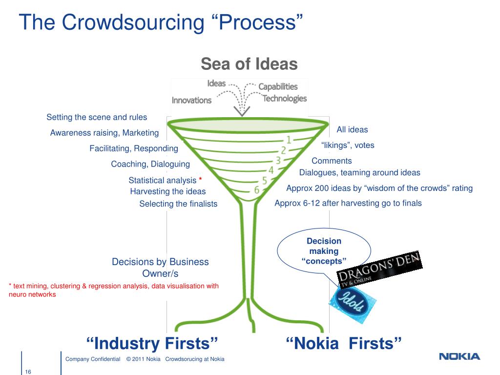 The Crowdsourcing “Process” Sea of Ideas Setting the scene and rules All ideas Awareness raising, Marketing “likings”, votes Facilitating, Responding Comments Coaching, Dialoguing Dialogues, teaming around ideas Statistical analysis * Approx 200 ideas by “wisdom of the crowds” rating Harvesting the ideas Approx 6-12 after harvesting go to finals Selecting the finalists Decision making “concepts” Decisions by Business Owner/s * text mining, clustering & regression analysis, data visualisation with neuro networks “Industry Firsts” “Nokia Firsts” Company Confidential © 2011 Nokia Crowdsorucing at Nokia