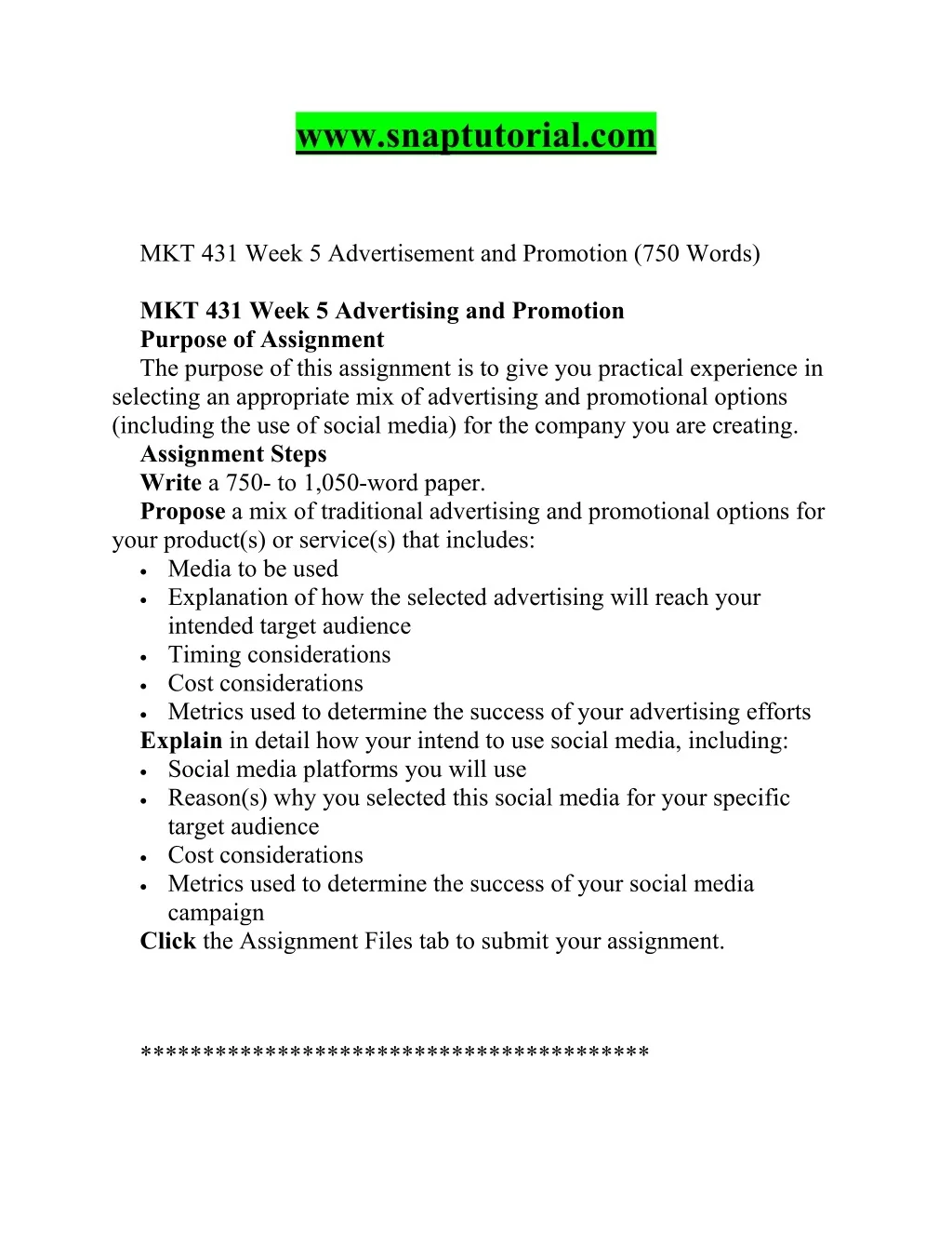 www.snaptutorial.com MKT 431 Week 5 Advertisement and Promotion (750 Words) MKT 431 Week 5 Advertising and Promotion Purpose of Assignment The purpose of this assignment is to give you practical experience in selecting an appropriate mix of advertising and promotional options (including the use of social media) for the company you are creating. Assignment Steps Write a 750- to 1,050-word paper. Propose a mix of traditional advertising and promotional options for your product(s) or service(s) that includes: Media to be used Explanation of how the selected advertising will reach your intended target audience Timing considerations Cost considerations Metrics used to determine the success of your advertising efforts Explain in detail how your intend to use social media, including: Social media platforms you will use Reason(s) why you selected this social media for your specific target audience Cost considerations Metrics used to determine the success of your social media campaign Click the Assignment Files tab to submit your assignment. *****************************************
