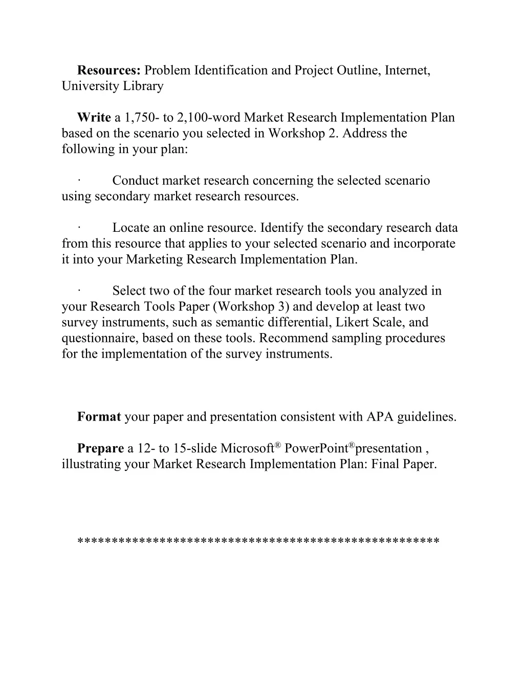 Resources: Problem Identification and Project Outline, Internet, University Library Write a 1,750- to 2,100-word Market Research Implementation Plan based on the scenario you selected in Workshop 2. Address the following in your plan: Conduct market research concerning the selected scenario using secondary market research resources. · Locate an online resource. Identify the secondary research data from this resource that applies to your selected scenario and incorporate it into your Marketing Research Implementation Plan. · Select two of the four market research tools you analyzed in your Research Tools Paper (Workshop 3) and develop at least two survey instruments, such as semantic differential, Likert Scale, and questionnaire, based on these tools. Recommend sampling procedures for the implementation of the survey instruments. · Format your paper and presentation consistent with APA guidelines. Prepare a 12- to 15-slide Microsoft®PowerPoint®presentation , illustrating your Market Research Implementation Plan: Final Paper. *****************************************************