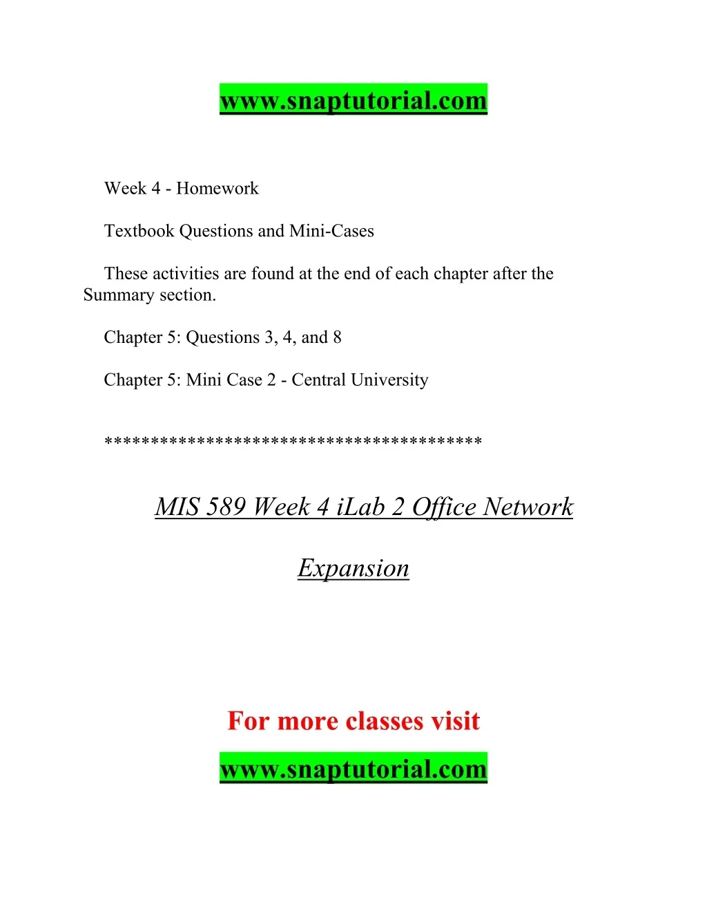 www.snaptutorial.com Week 4 - Homework Textbook Questions and Mini-Cases These activities are found at the end of each chapter after the Summary section. Chapter 5: Questions 3, 4, and 8 Chapter 5: Mini Case 2 - Central University ***************************************** MIS 589 Week 4 iLab 2 Office Network Expansion For more classes visit www.snaptutorial.com
