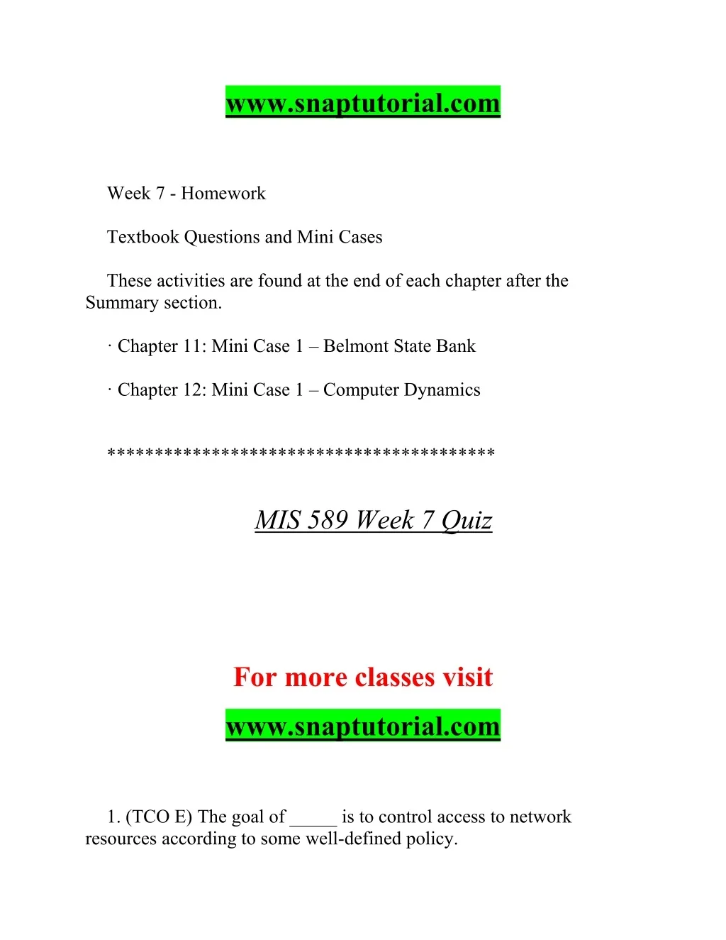 www.snaptutorial.com Week 7 - Homework Textbook Questions and Mini Cases These activities are found at the end of each chapter after the Summary section. · Chapter 11: Mini Case 1 – Belmont State Bank · Chapter 12: Mini Case 1 – Computer Dynamics ***************************************** MIS 589 Week 7 Quiz For more classes visit www.snaptutorial.com 1. (TCO E) The goal of _____ is to control access to network resources according to some well-defined policy.